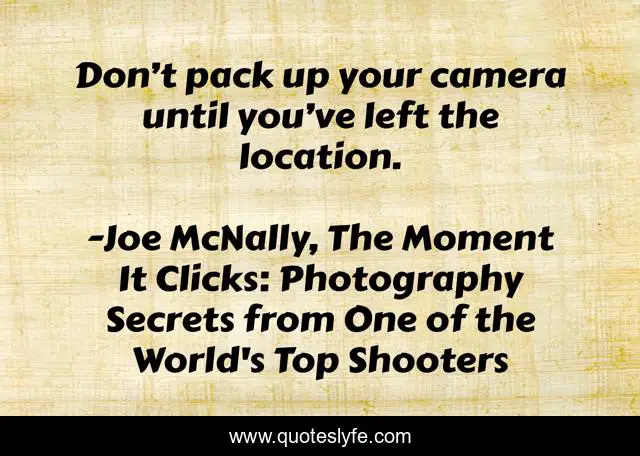 This page presents the quote "Don’t pack up your camera until you’ve left the location.". Author of this quote is Joe McNally, The Moment It Clicks: Photography Secrets from One of the World's Top Shooters. .