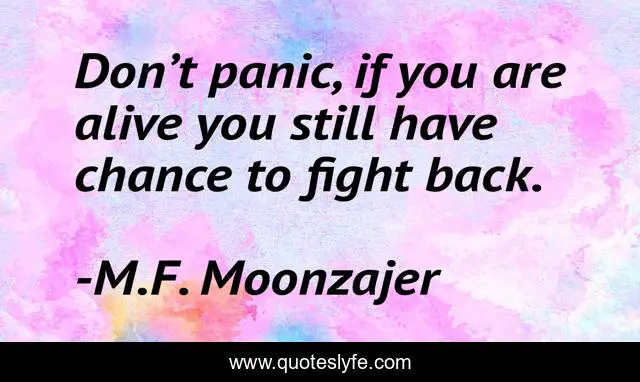 This page presents the quote "Don’t panic, if you are alive you still have chance to fight back.". Author of this quote is M.F. Moonzajer. This quote is about panic, alive, fight,.
