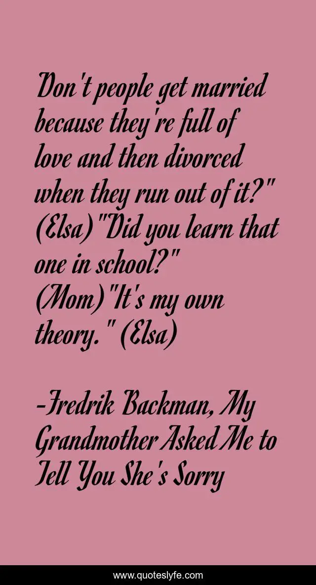 This page presents the quote "Don't people get married because they're full of love and then divorced when they run out of it?" (Elsa)"Did you learn that one in school?" (Mom)"It's my own theory." (Elsa)". Author of this quote is Fredrik Backman, My Grandmother Asked Me to Tell You She's Sorry. This quote is about love, marriage, affection,.