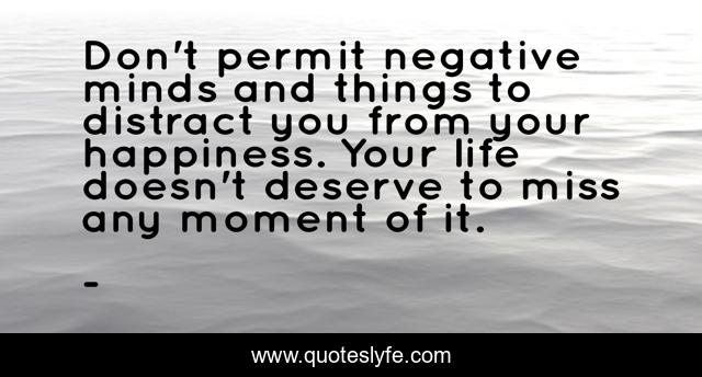 This page presents the quote "Don't permit negative minds and things to distract you from your happiness. Your life doesn't deserve to miss any moment of it.". Author of this quote is . This quote is about edmond-mbiaka, negative-things, your-life-serves-happiness, negative-minds,.
