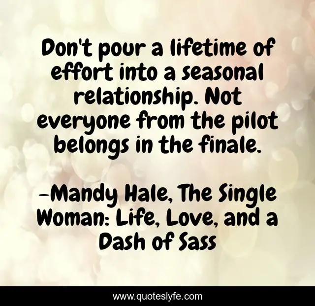 This page presents the quote "Don't pour a lifetime of effort into a seasonal relationship. Not everyone from the pilot belongs in the finale.". Author of this quote is Mandy Hale, The Single Woman: Life, Love, and a Dash of Sass. This quote is about relationships, evolution, letting-go, finale, positive-thinking, seasonal-relationships, growth, seasons-of-life, seasons,.