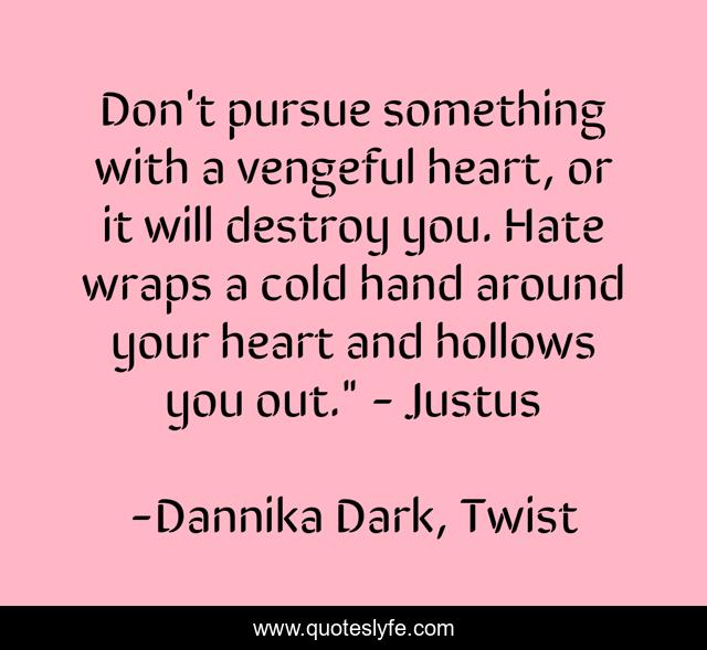 This page presents the quote "Don't pursue something with a vengeful heart, or it will destroy you. Hate wraps a cold hand around your heart and hollows you out." - Justus". Author of this quote is Dannika Dark, Twist. This quote is about vengeful, heart, justus, urban-fantasy, hollow, twist, cold-hand, mageri, hate,.