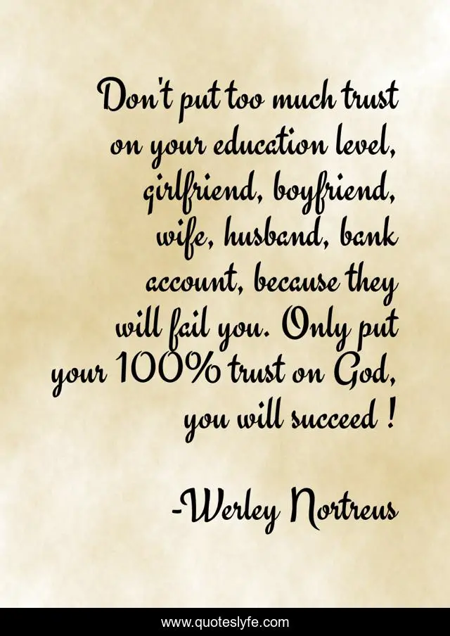 This page presents the quote "Don't put too much trust on your education level, girlfriend, boyfriend, wife, husband, bank account, because they will fail you. Only put your 100% trust on God, you will succeed !". Author of this quote is Werley Nortreus. This quote is about life-and-living, werley-nortreus, trust, life-lessons, trusting-god,.