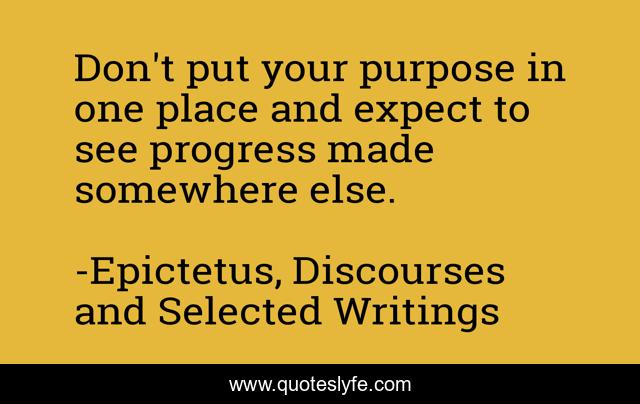 This page presents the quote "Don't put your purpose in one place and expect to see progress made somewhere else.". Author of this quote is Epictetus, Discourses and Selected Writings. .