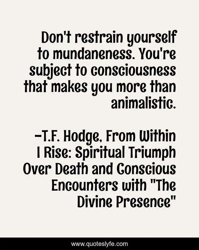 "T.F. Hodge, From Within I Rise: Spiritual Triumph Over Death and Conscious Encounters with "The Divine Presence" Quotes." Quoteslyfe.com, 2025. Mon. 08 Dec. 2025. <https://www.quoteslyfe.com/quote/Don-t-restrain-yourself-to-mundaneness-You-181567>.
