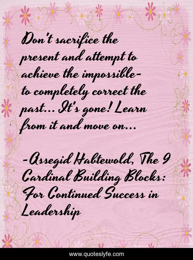 This page presents the quote "Don't sacrifice the present and attempt to achieve the impossible- to completely correct the past... It's gone! Learn from it and move on...". Author of this quote is Assegid Habtewold, The 9 Cardinal Building Blocks: For Continued Success in Leadership. This quote is about move-on, sacrifice, the-present, the-past,.