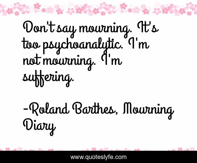 This page presents the quote "Don't say mourning. It's too psychoanalytic. I'm not mourning. I'm suffering.". Author of this quote is Roland Barthes, Mourning Diary. This quote is about loss, mourning,.