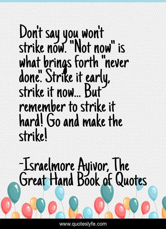 This page presents the quote "Don't say you won't strike now. "Not now" is what brings forth "never done". Strike it early, strike it now... But remember to strike it hard! Go and make the strike!". Author of this quote is Israelmore Ayivor, The Great Hand Book of Quotes. This quote is about never-done, earyly, right, hard, israelmore-ayivor, strong-shot, winner, food-for-thought, excellent,.