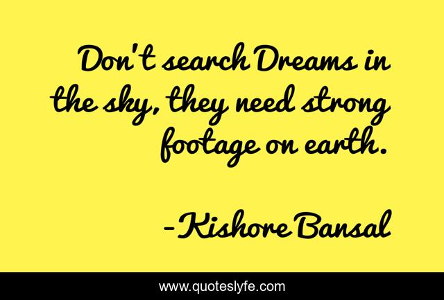 This page presents the quote "Don't search Dreams in the sky, they need strong footage on earth.". Author of this quote is Kishore Bansal. This quote is about footage, strong, sky, search, dreams,.