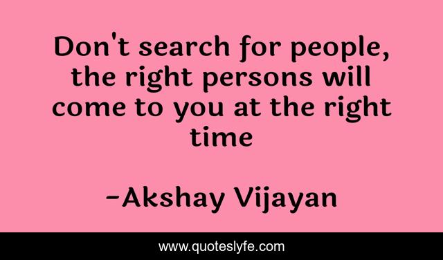 This page presents the quote "Don't search for people, the right persons will come to you at the right time". Author of this quote is Akshay Vijayan. This quote is about life, love, people, inspirational, enthusiasm, friendship, affection,.