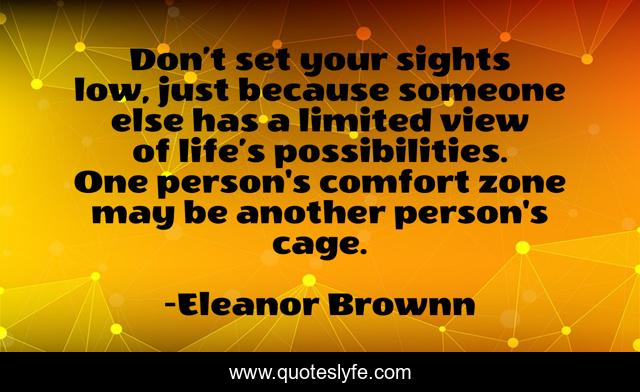 This page presents the quote "Don’t set your sights low, just because someone else has a limited view of life’s possibilities. One person's comfort zone may be another person's cage.". Author of this quote is Eleanor Brownn. This quote is about leadership, goals, vision,.