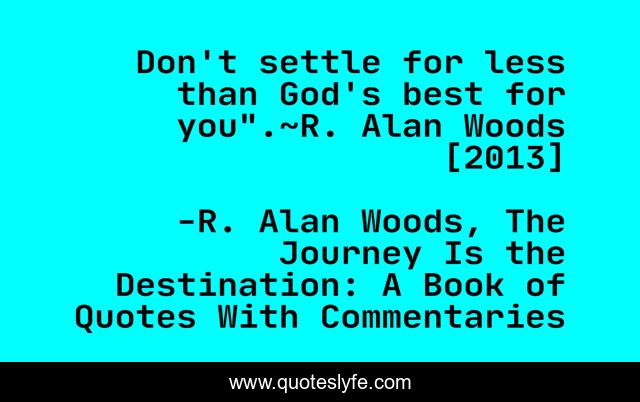This page presents the quote "Don't settle for less than God's best for you".~R. Alan Woods [2013]". Author of this quote is R. Alan Woods, The Journey Is the Destination: A Book of Quotes With Commentaries. This quote is about excellency, highest-good, r-alan-woods, destiny,.