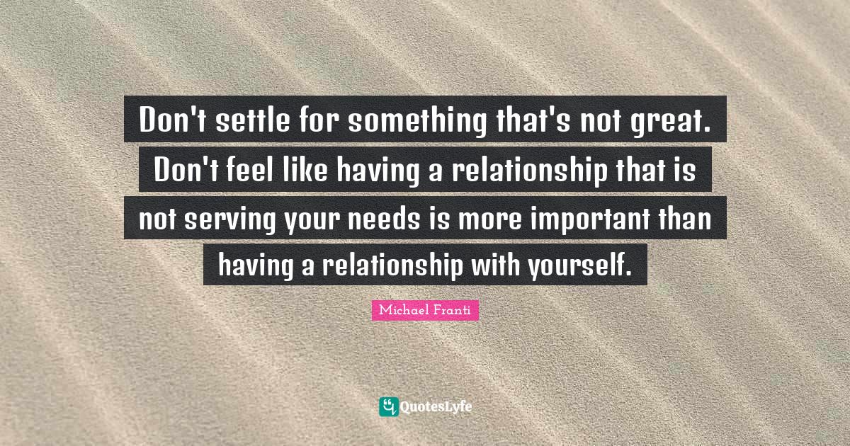 This page presents the quote "Don't settle for something that's not great. Don't feel like having a relationship that is not serving your needs is more important than having a relationship with yourself.". Author of this quote is Michael Franti. This quote is about important, settling, needs, relationship, serving,.