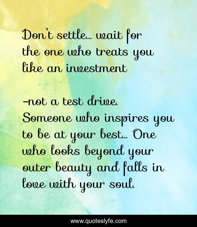 This page presents the quote "Don’t settle… wait for the one who treats you like an investment". Author of this quote is not a test drive. Someone who inspires you to be at your best… One who looks beyond your outer beauty and falls in love with your soul.. .