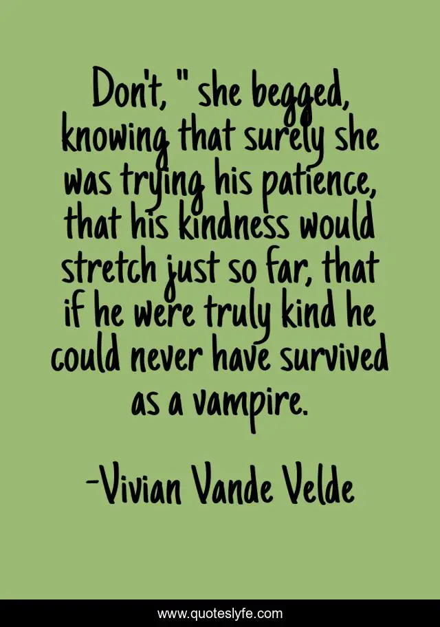 This page presents the quote "Don't, " she begged, knowing that surely she was trying his patience, that his kindness would stretch just so far, that if he were truly kind he could never have survived as a vampire.". Author of this quote is Vivian Vande Velde. This quote is about kindness, vampires,.
