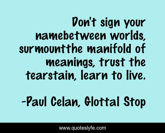 This page presents the quote "Don't sign your namebetween worlds, surmountthe manifold of meanings, trust the tearstain, learn to live.". Author of this quote is Paul Celan, Glottal Stop. This quote is about living, meaning, trust, tearstain, poetry,.