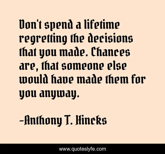 This page presents the quote "Don't spend a lifetime regretting the decisions that you made. Chances are, that someone else would have made them for you anyway.". Author of this quote is Anthony T. Hincks. This quote is about chances, lifetime, philosophy, decisions, regrets,.