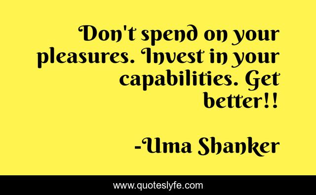 This page presents the quote "Don't spend on your pleasures. Invest in your capabilities. Get better!!". Author of this quote is Uma Shanker. This quote is about learning, career-growth, values, self-improvement, life-skills, personality-development,.