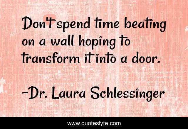 This page presents the quote "Don't spend time beating on a wall hoping to transform it into a door.". Author of this quote is Dr. Laura Schlessinger. This quote is about realistic, expectations,.