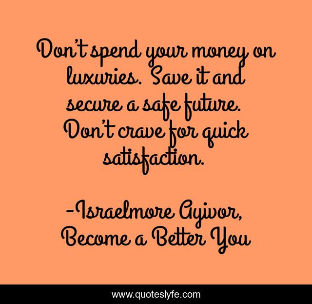 This page presents the quote "Don’t spend your money on luxuries. Save it and secure a safe future. Don’t crave for quick satisfaction.". Author of this quote is Israelmore Ayivor, Become a Better You. This quote is about inspirations, delay-your-gratification, money, satisfaction, optimistic, investment, luxuries, food-for-thought, positive,.