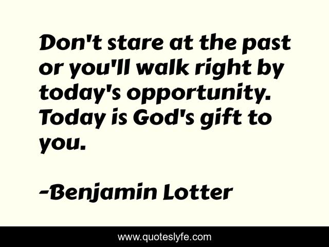 This page presents the quote "Don't stare at the past or you'll walk right by today's opportunity. Today is God's gift to you.". Author of this quote is Benjamin Lotter. This quote is about opportunity, encouragement,.
