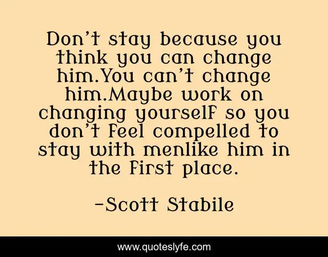 This page presents the quote "Don’t stay because you think you can change him.You can’t change him.Maybe work on changing yourself so you don’t feel compelled to stay with menlike him in the first place.". Author of this quote is Scott Stabile. This quote is about relationships, love, change, affection,.