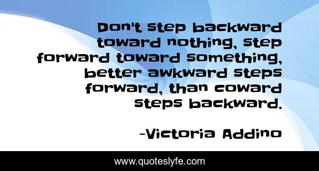 This page presents the quote "Don't step backward toward nothing, step forward toward something, better awkward steps forward, than coward steps backward.". Author of this quote is Victoria Addino. This quote is about enthusiasm, facets-victoria-addino, inspirational, positive-thinking,.