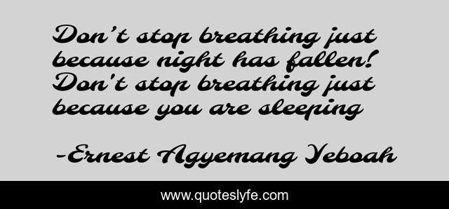 This page presents the quote "Don’t stop breathing just because night has fallen! Don't stop breathing just because you are sleeping". Author of this quote is Ernest Agyemang Yeboah. This quote is about challenges, suicide, move-on, difficult-times, do-it-again, don-t-give-up, don-t-quit, moving-on, do-it,.