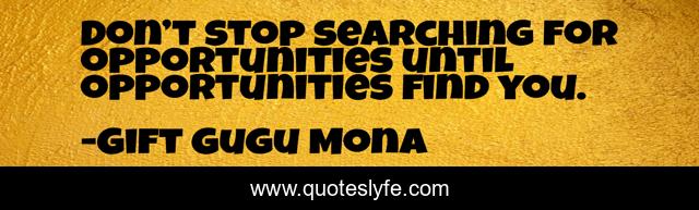 This page presents the quote "Don’t stop searching for opportunities until opportunities find you.". Author of this quote is Gift Gugu Mona. This quote is about find, opportunities, searching,.