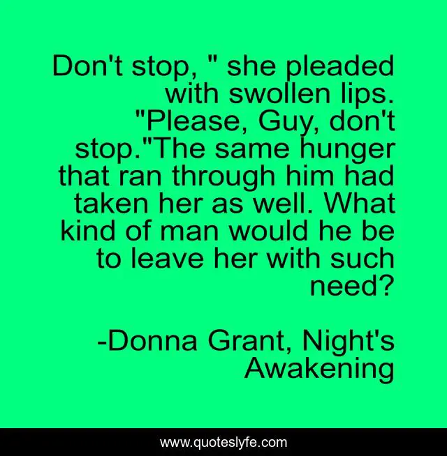 This page presents the quote "Don't stop, " she pleaded with swollen lips. "Please, Guy, don't stop."The same hunger that ran through him had taken her as well. What kind of man would he be to leave her with such need?". Author of this quote is Donna Grant, Night's Awakening. This quote is about scottish-dragon-kings, paranormal-romance, dragons,.