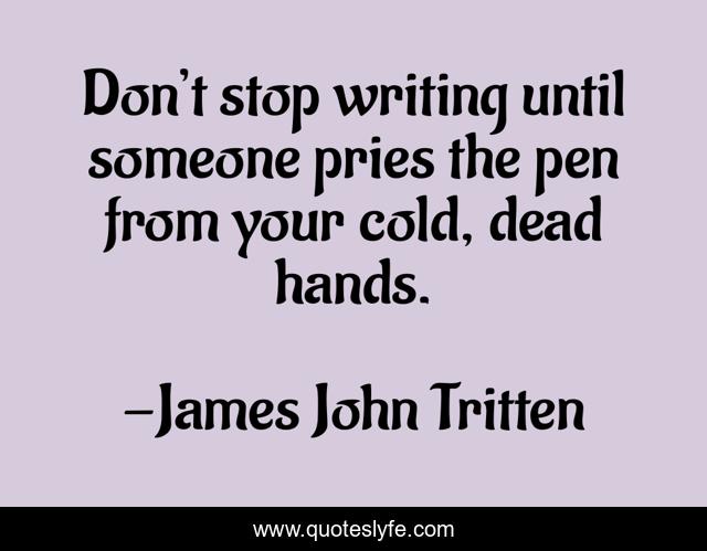 This page presents the quote "Don’t stop writing until someone pries the pen from your cold, dead hands.". Author of this quote is James John Tritten. This quote is about humorous, enthusiasm, inspirational, writing-advice,.