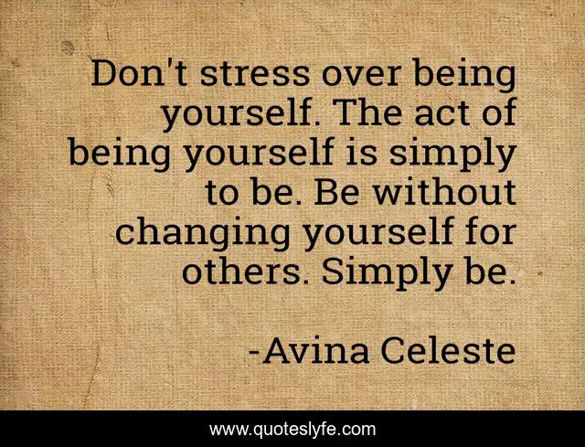 This page presents the quote "Don't stress over being yourself. The act of being yourself is simply to be. Be without changing yourself for others. Simply be.". Author of this quote is Avina Celeste. This quote is about stress, being, positive, motivational, confidence, optimistic, inspirational, enthusiasm,.