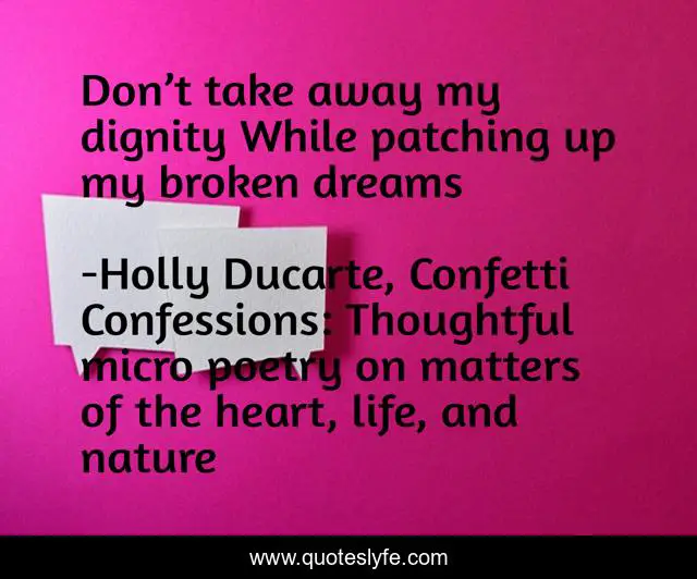 This page presents the quote "Don’t take away my dignity While patching up my broken dreams". Author of this quote is Holly Ducarte, Confetti Confessions: Thoughtful micro poetry on matters of the heart, life, and nature. This quote is about love, poetry, poetryquote, heartbreak, shortpoem, affection,.