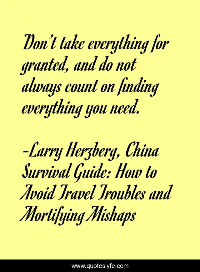 "Larry Herzberg, China Survival Guide: How to Avoid Travel Troubles and Mortifying Mishaps Quotes." Quoteslyfe.com, 2025. Fri. 05 Dec. 2025. <https://www.quoteslyfe.com/quote/Don-t-take-everything-for-granted-and-137627>.