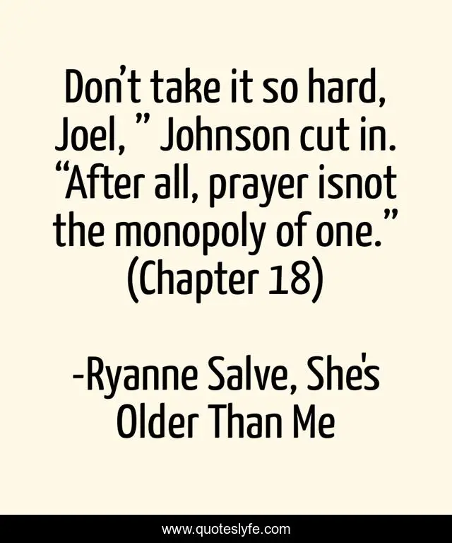 This page presents the quote "Don’t take it so hard, Joel, ” Johnson cut in. “After all, prayer isnot the monopoly of one.” (Chapter 18)". Author of this quote is Ryanne Salve, She's Older Than Me. .