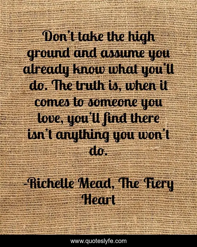 This page presents the quote "Don’t take the high ground and assume you already know what you’ll do. The truth is, when it comes to someone you love, you’ll find there isn’t anything you won’t do.". Author of this quote is Richelle Mead, The Fiery Heart. This quote is about abe-mazur, love, affection, wisdom,.