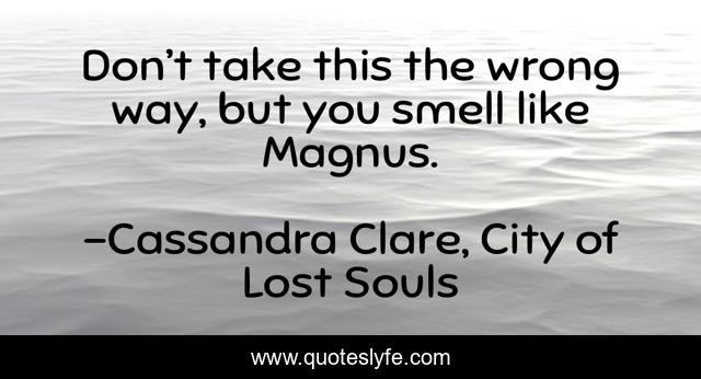 This page presents the quote "Don’t take this the wrong way, but you smell like Magnus.". Author of this quote is Cassandra Clare, City of Lost Souls. This quote is about humour, smelling-like-magnus,.