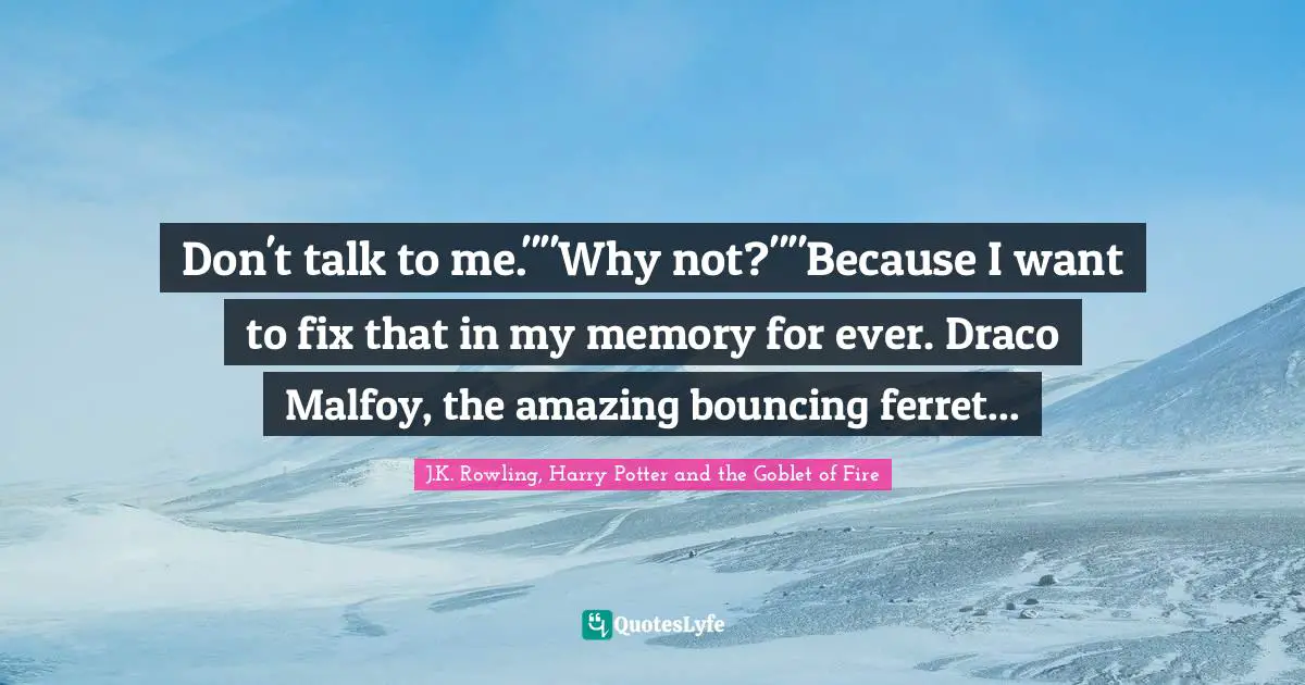 This page presents the quote "Don't talk to me.""Why not?""Because I want to fix that in my memory for ever. Draco Malfoy, the amazing bouncing ferret...". Author of this quote is J.K. Rowling, Harry Potter and the Goblet of Fire. This quote is about ferret-malfoy, ron-weasley, humor, harry-potter,.