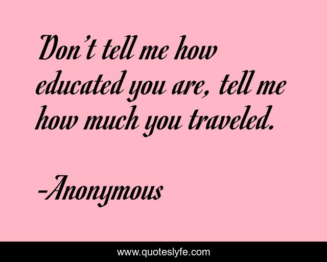 This page presents the quote "Don’t tell me how educated you are, tell me how much you traveled.". Author of this quote is Anonymous. This quote is about travel, education,.