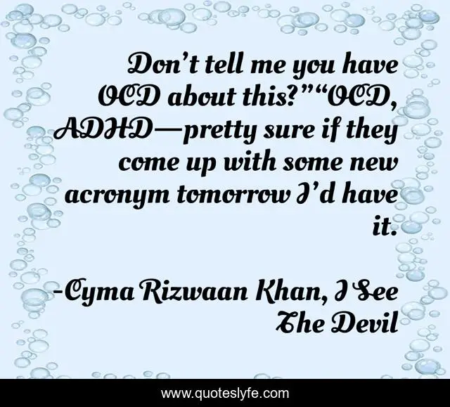 This page presents the quote "Don’t tell me you have OCD about this?”“OCD, ADHD—pretty sure if they come up with some new acronym tomorrow I’d have it.". Author of this quote is Cyma Rizwaan Khan, I See The Devil. This quote is about life, humor, humorous, positive, motivational, m, confidence, optimistic, inspirational,.