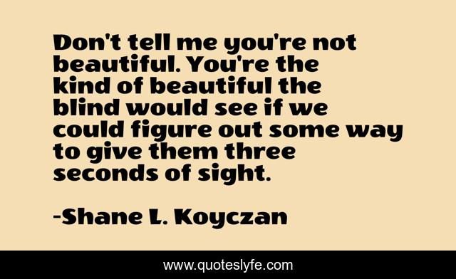 This page presents the quote "Don't tell me you're not beautiful. You're the kind of beautiful the blind would see if we could figure out some way to give them three seconds of sight.". Author of this quote is Shane L. Koyczan. This quote is about stop-signs, poetry, canadian,.