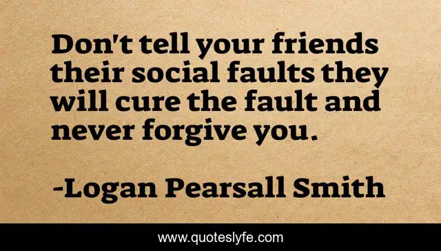 This page presents the quote "Don't tell your friends their social faults they will cure the fault and never forgive you.". Author of this quote is Logan Pearsall Smith. This quote is about friends, friendship,.