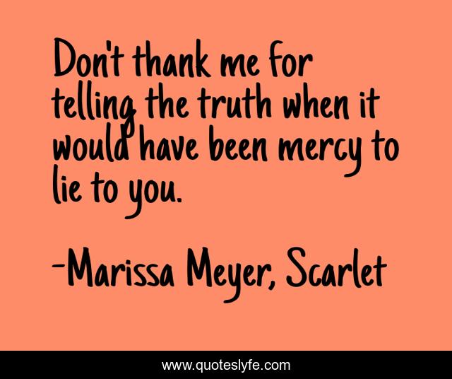 This page presents the quote "Don't thank me for telling the truth when it would have been mercy to lie to you.". Author of this quote is Marissa Meyer, Scarlet. This quote is about lies, honesty, truth, mercy,.