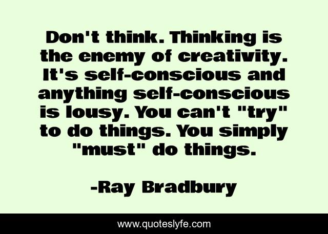 This page presents the quote "Don't think. Thinking is the enemy of creativity. It's self-conscious and anything self-conscious is lousy. You can't "try" to do things. You simply "must" do things.". Author of this quote is Ray Bradbury. This quote is about enthusiasm, inspirational,.