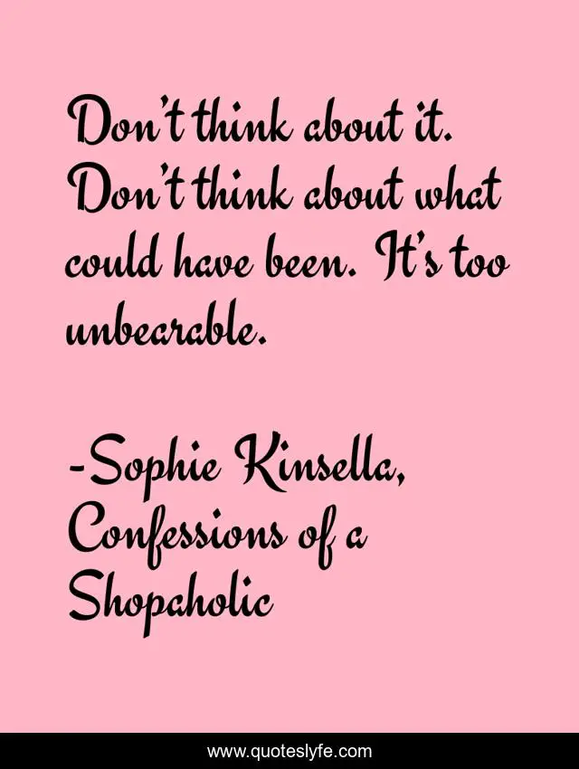 This page presents the quote "Don’t think about it. Don’t think about what could have been. It’s too unbearable.". Author of this quote is Sophie Kinsella, Confessions of a Shopaholic. This quote is about decisions, life, humor,.