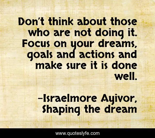 This page presents the quote "Don’t think about those who are not doing it. Focus on your dreams, goals and actions and make sure it is done well.". Author of this quote is Israelmore Ayivor, Shaping the dream. This quote is about food-for-thought, sure, dream-big, thinking, big-dreams, well, focus, actions, positive-thinking,.