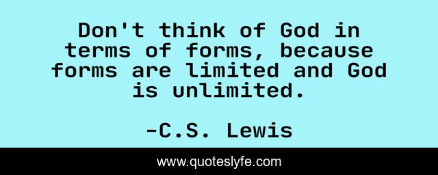 This page presents the quote "Don't think of God in terms of forms, because forms are limited and God is unlimited.". Author of this quote is C.S. Lewis. .