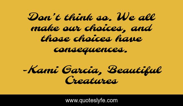 This page presents the quote "Don’t think so. We all make our choices, and those choices have consequences.". Author of this quote is Kami Garcia, Beautiful Creatures. This quote is about consequences, choice,.