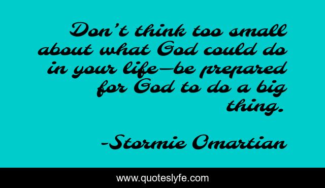 This page presents the quote "Don’t think too small about what God could do in your life—be prepared for God to do a big thing.". Author of this quote is Stormie Omartian. This quote is about relationships, motivation, strength, christian, uplifting, power, advice, powerful, encouraging,.