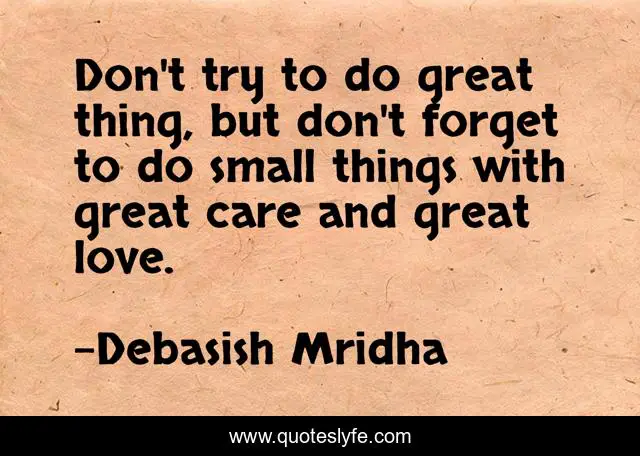 This page presents the quote "Don't try to do great thing, but don't forget to do small things with great care and great love.". Author of this quote is Debasish Mridha. This quote is about life, love, knowledge, inspirational, intelligence, philosophy, wisdom, quotes, affection,.